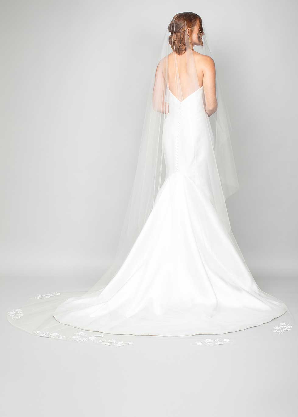 Our Oasis veil is ethereal and romantic with the floral applique design along the train.