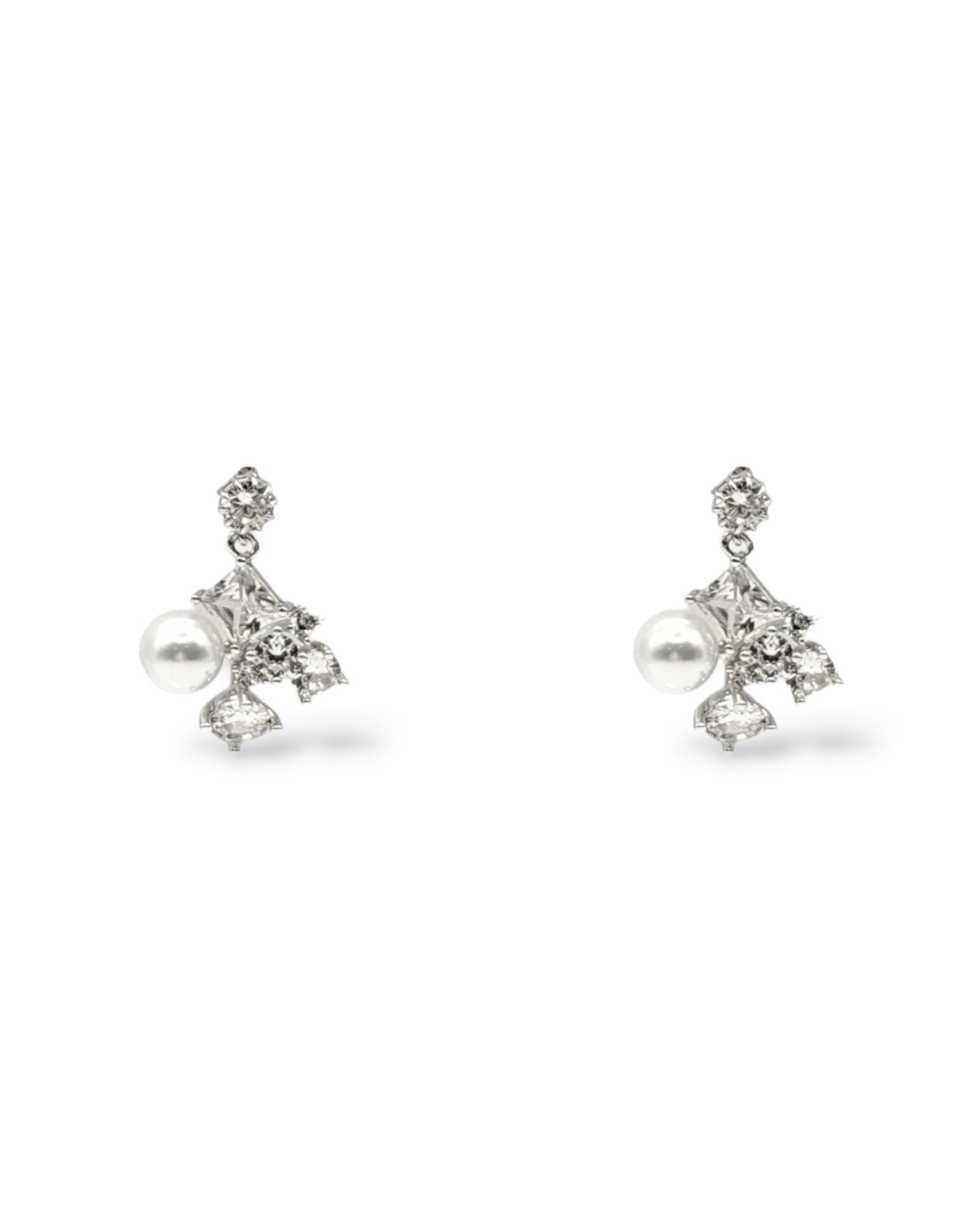 Featuring our Odelia earrings in silver. A mix of crystal and pearls.