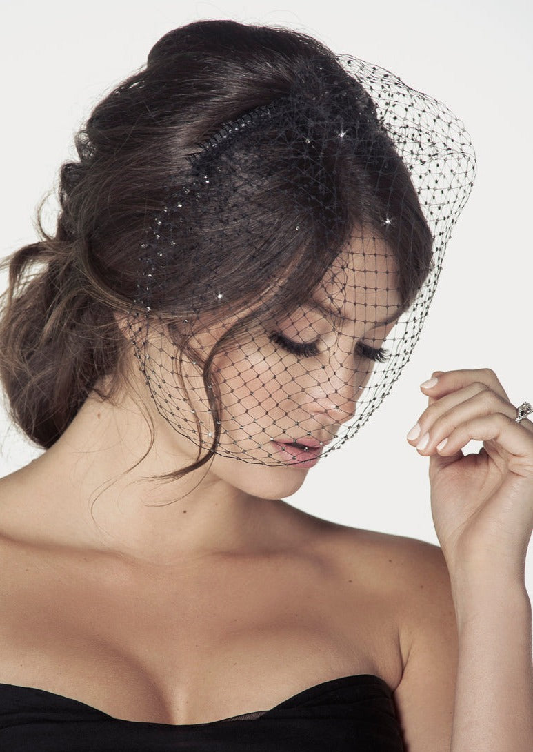 Featuring our Cassidy birdcage in black embellished with Austrian black crystals.