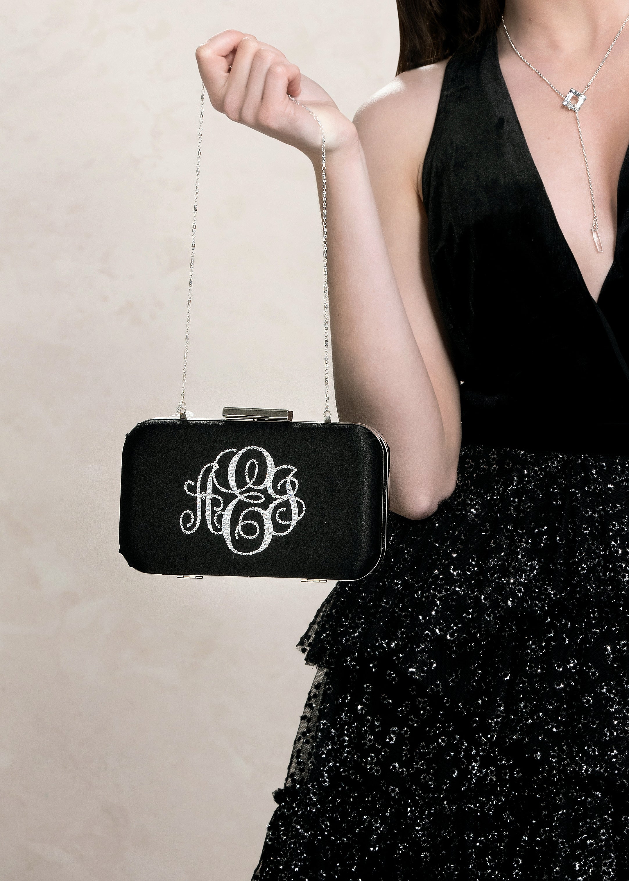 Clutch shown: Our top selling Glam monogram crystal clutch shown in black. Available in a variety of colorways to match your style and personality.