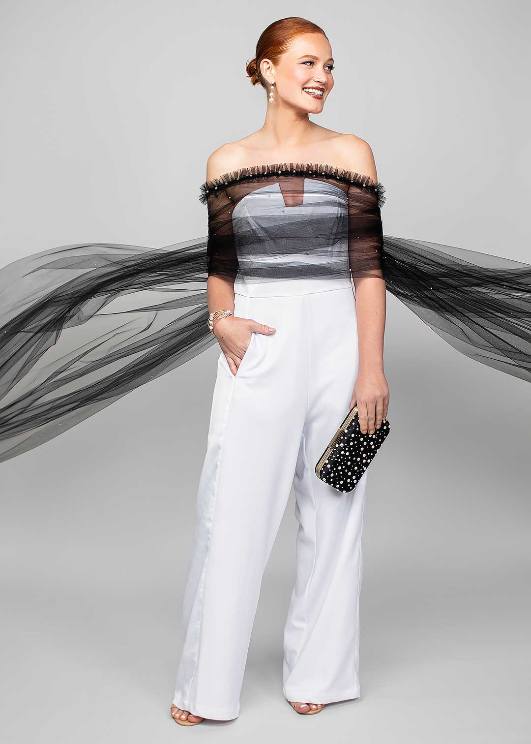 Our Ophelia pearl wrap in black paired with the Octavia clutch and our pearl jewelry for some glam.