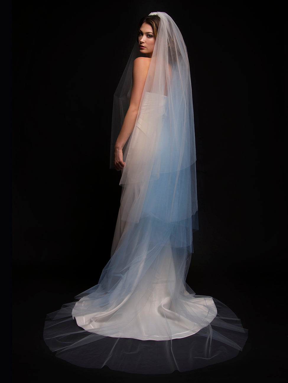 Add a touch of something blue to your bridal look with a soft blue veil, like our Duet veil shown in a light ivory and light blue tulle.