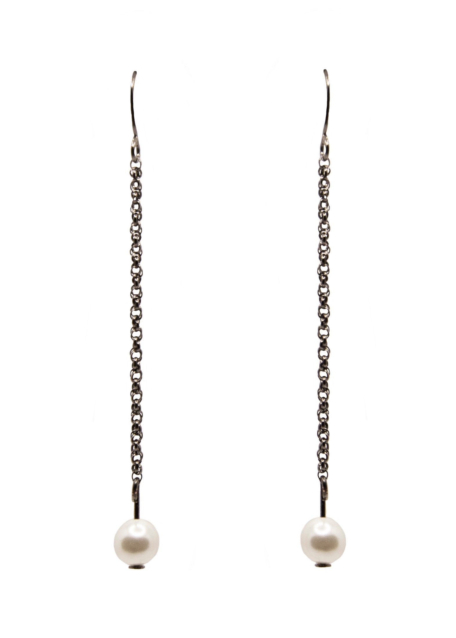 Pave crystal elongated post earrings with a crystal pave rope and pearl bow drop, designed for festive occasions shown in stunning silver.