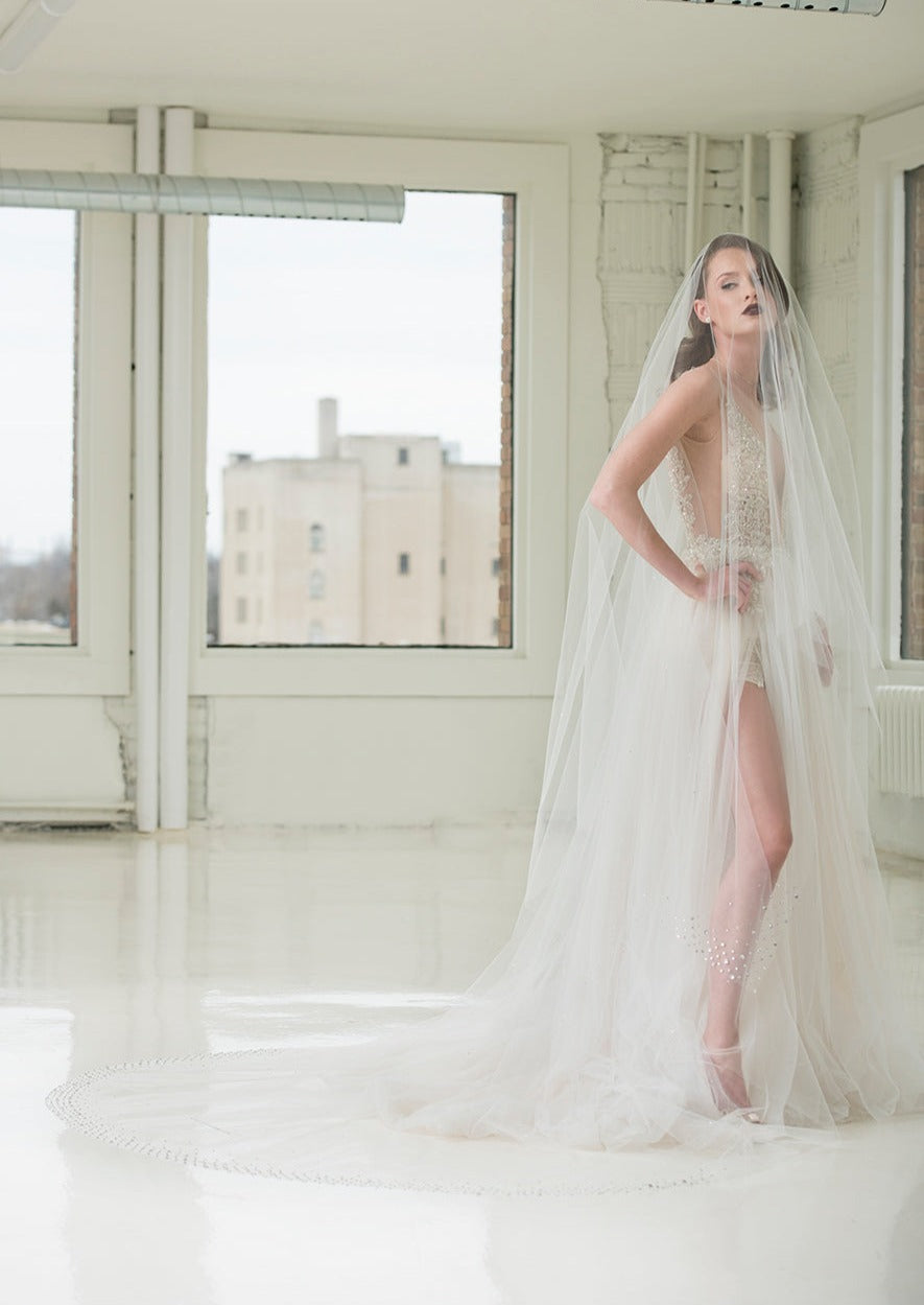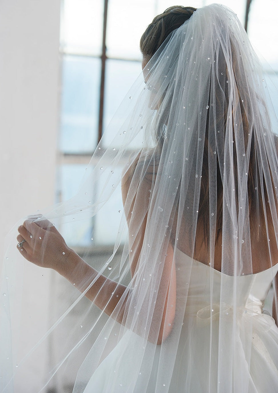 Cathedral-length wedding veil with Austrian pearl bow design along the border of the veil for a modern feminine on trend bridal look detail.