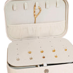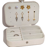 Our travel jewelry box is the perfect personal gift for anyone on your list! The perfect gift for a friend, bridesmaid, bride-to-be or just to buy for yourself. You get to personalize the jewelry box with an initial (A-Z) made with the highest quality brilliant cut crystals, showing you put some thought into your gift. The outside is available as a soft ivory sparkle with a silver clasp closure. The inside has a place to hang 5 necklaces, with a divider that holds up to 10 pair of earrings. The bottom has a beautiful ring holder and 3 adjustable compartments on the right side that can hold bracelets or other loose items. This compact jewelry case can easily fit in your purse or travel bag. It measures 6.5 inches wide, by 4.5 inches long and approximately 2 inches high.