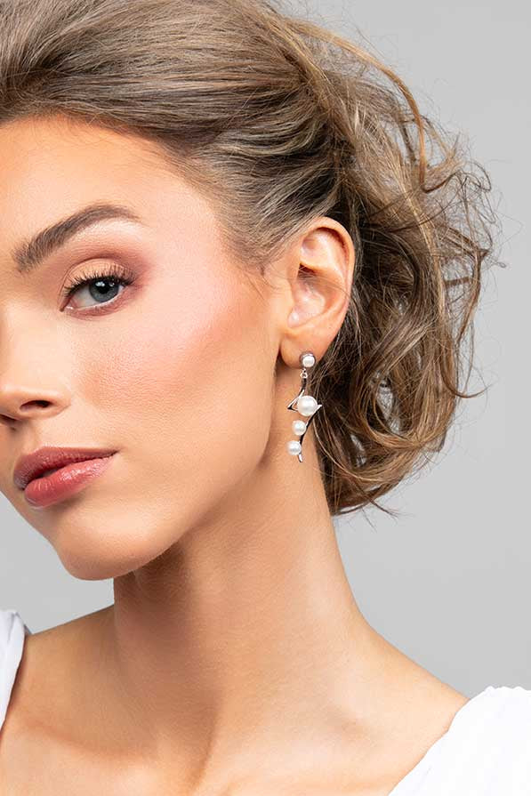 Woman with blonde hair wearing silver earrings against a neutral background