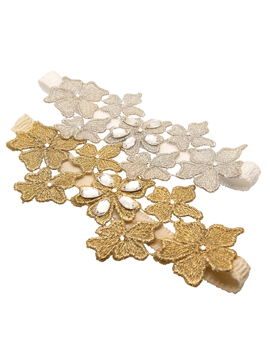 Walk down the aisle and complete your bridal look with the contemporary and romantic metallic floral DAYA garter. The metallic lace is adorned with the highest quality crystals. The center flower has hand sewn pear shaped brilliant cut crystals to represent the petals of the flower. Each flower pistol on the lace is also embellished with a single crystal to add optimal sparkle to your wedding garter. Available in modern bright silver and vintage gold, this garter will be the finishing touch a bride needs on her wedding day. The popular garter measures to a standard 14 inches around. The lace is attached to a .5 inch wide soft elastic for optimal stretch and comfort.