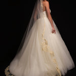 Add a romantic finishing touch to your bridal look with this vintage inspired wedding veil. DELPHINE is a mantilla cut chapel length veil that is embellished with a soft French Chantilly lace trim around the entire border of the veil. The lace is narrower towards the top and becomes wider along the bottom. The wide width and modest train allows this veil to be paired with a soft bridal gown silhouettes — sheath, mermaid, trumpet, a-line and fit-and-flare dresses. Attached to a 3 inch wide metal comb, this bridal veil will stay securely in your hair. This stunning piece is available in traditional ivory but trimmed with modern gold lace. Delphine is a chapel length wedding veil measuring to a standard 90 inches long and 90 inches wide.