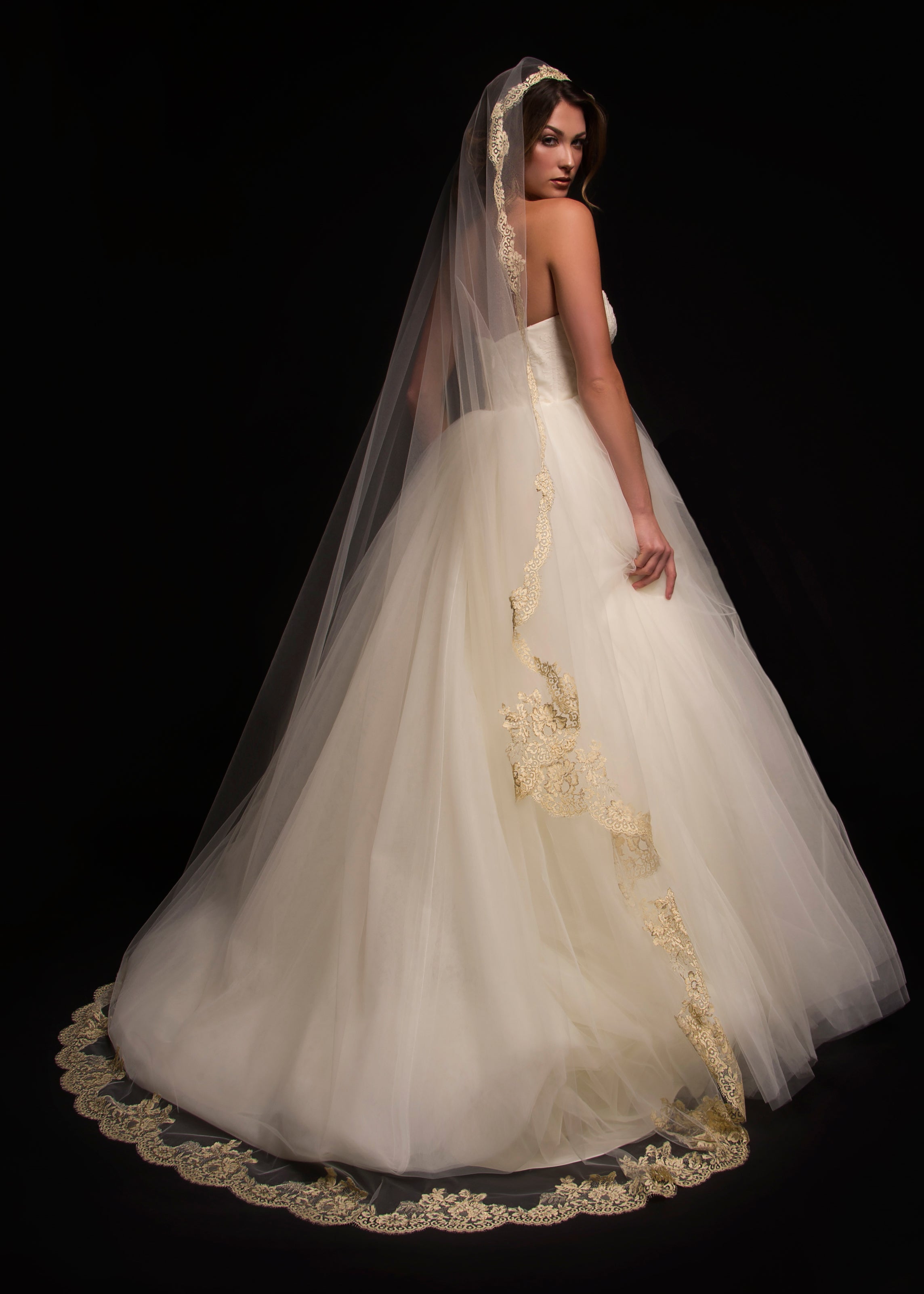 Delphine Metallic Gold Chantilly Lace Mantilla Chapel Veil