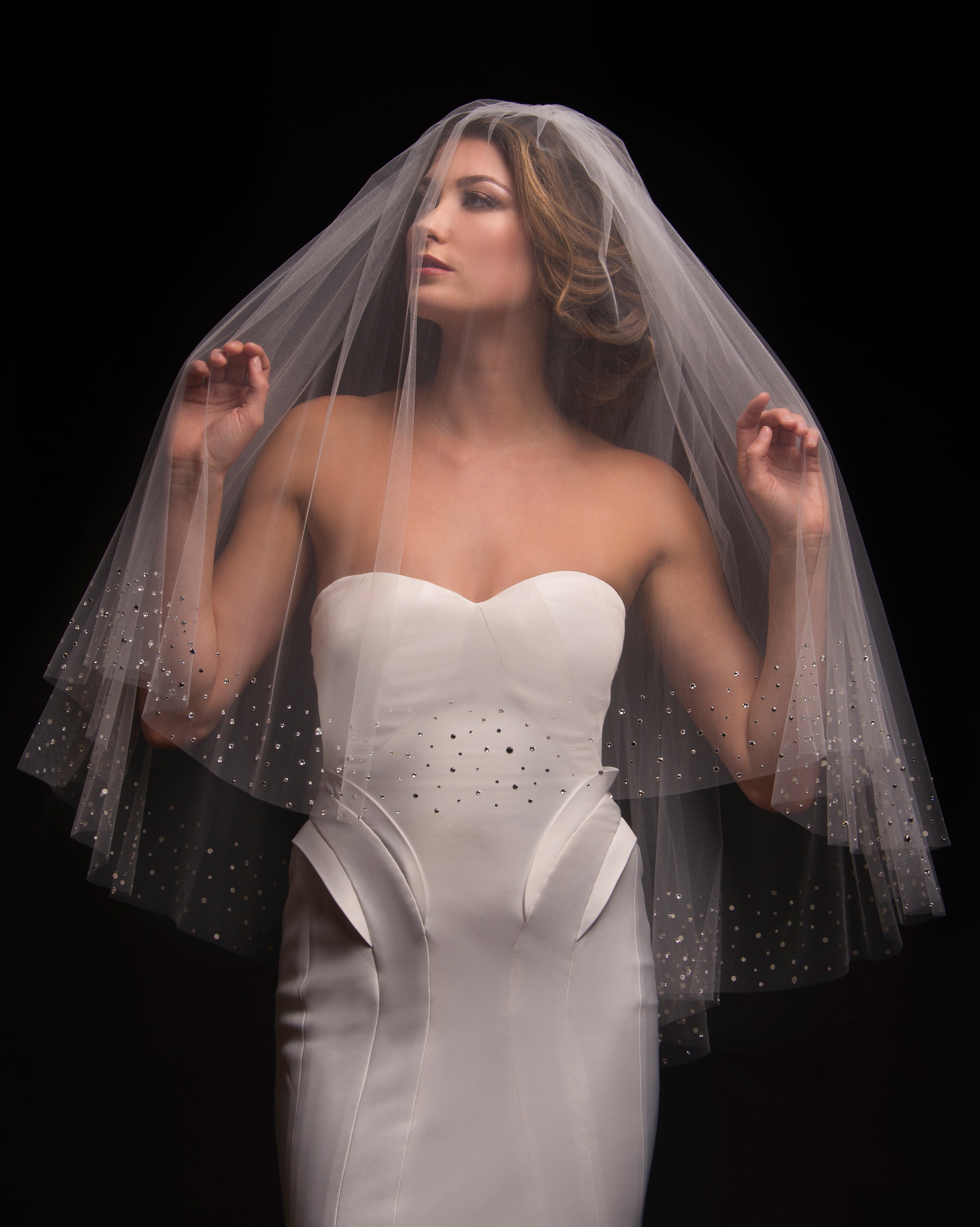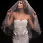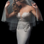 Fulfill your DESTINY with this glamorous sparkle to your bridal look with the elegant Destiny wedding veil. This two-tier fingertip length raw cut edge fold over bridal veil is embellished with over 2,000 hand place brilliant cut crystals. The crystals are condensed and scattered along the border of the veil, and to provide even more sparkle the blusher has double-sided crystals. With a small amount of gathers at the comb, this luxurious veil is attached to a 3 inch wide silver metal comb to stay securely in your hair. This stunning veil is available in a soft blush. Destiny is a two-tier fingertip length wedding veil measuring to a standard 30 inch long blusher and 42 inch long bottom tier.