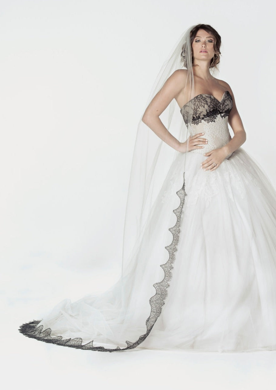 Complete your wedding day look with the romantic ETHEL bridal veil. This one-tier cathedral length wedding veil is trimmed with a fine pencil edge. Approximately 36 inches down from the comb, there is a delicate French Chantilly lace trim along the border of the veil. It is wide along the train, which then tapers out at the fingertip. Create a black and white wedding by adding some drama to your bridal look by doing the lace in black and the tulle in light ivory — as shown in the listing image. Ethel is attached to a 4.5 inch silver metal comb, which will stay securely in your hair. Ethel measures to a standard 108 inches long and is 72 inches wide.