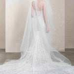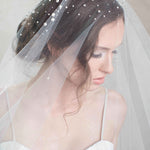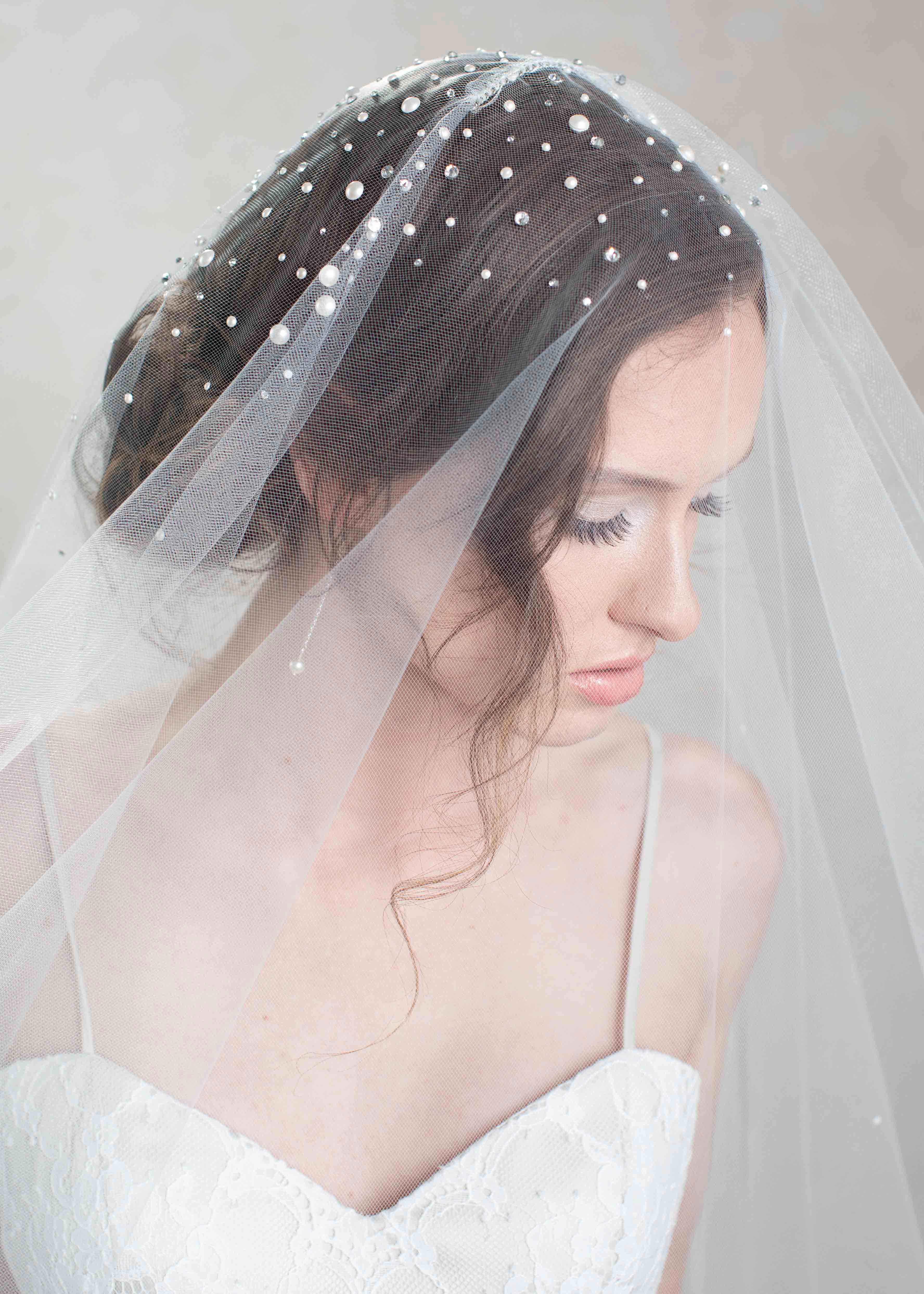 The ILLUSTRIA pearl and crystal veil will add the finishing touch to your wedding day look. This two-tier cathedral length veil measures 108 inches long, adding a romantic feel to your bridal ensemble. The fold-over cut will add a beautiful cascade to the back of your bridal gown. Attached to a 3 inch wide silver metal comb, this veil will stay securely in your hair. The raw edge will also allow the veil to blend in with your dress. No need for a hairpiece, this veil has ALL the drama you’ve been looking for.