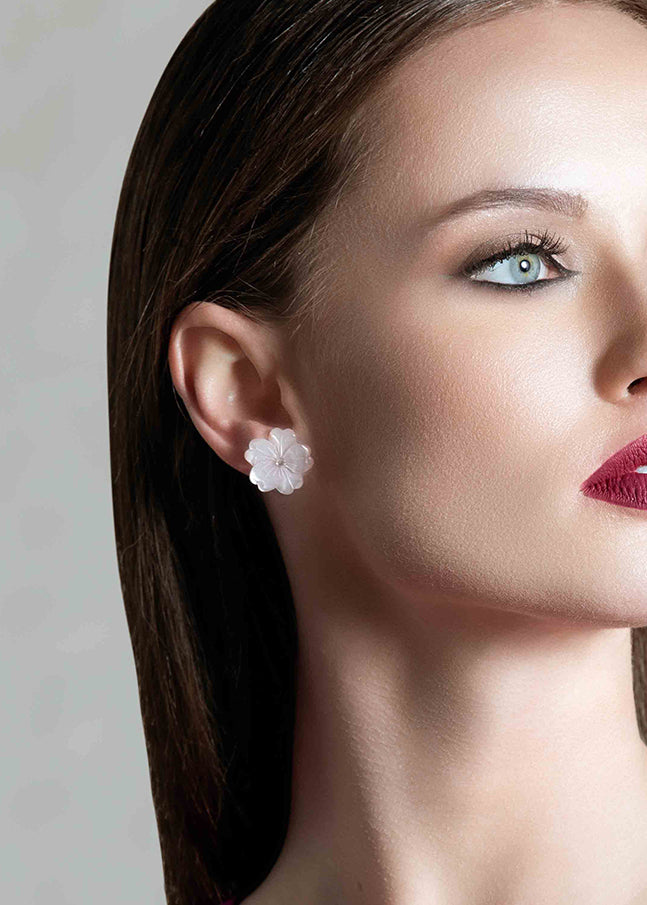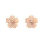 The INA mother-of-pearl finest crystal flower stud earrings are sweet and feminine, adding a modern-vintage touch to your look. These light weight nickel-free back metal earrings are simple enough that they can be worn for any occasion. Available in four different colors; you can choose from a sweet blush, romantic rose, bright yellow, or a traditional ivory pearl. The center pistol of the blush flowers is a silk blush brilliant cut crystal stone. The center stone of the ivory flowers is a clear brilliant cut crystal. They are attached to a push-back backing to make it easy to place in the ear, and come with a butterfly backing to stay securely in place. The flowers measure to approximately .75 inches in diameter.