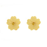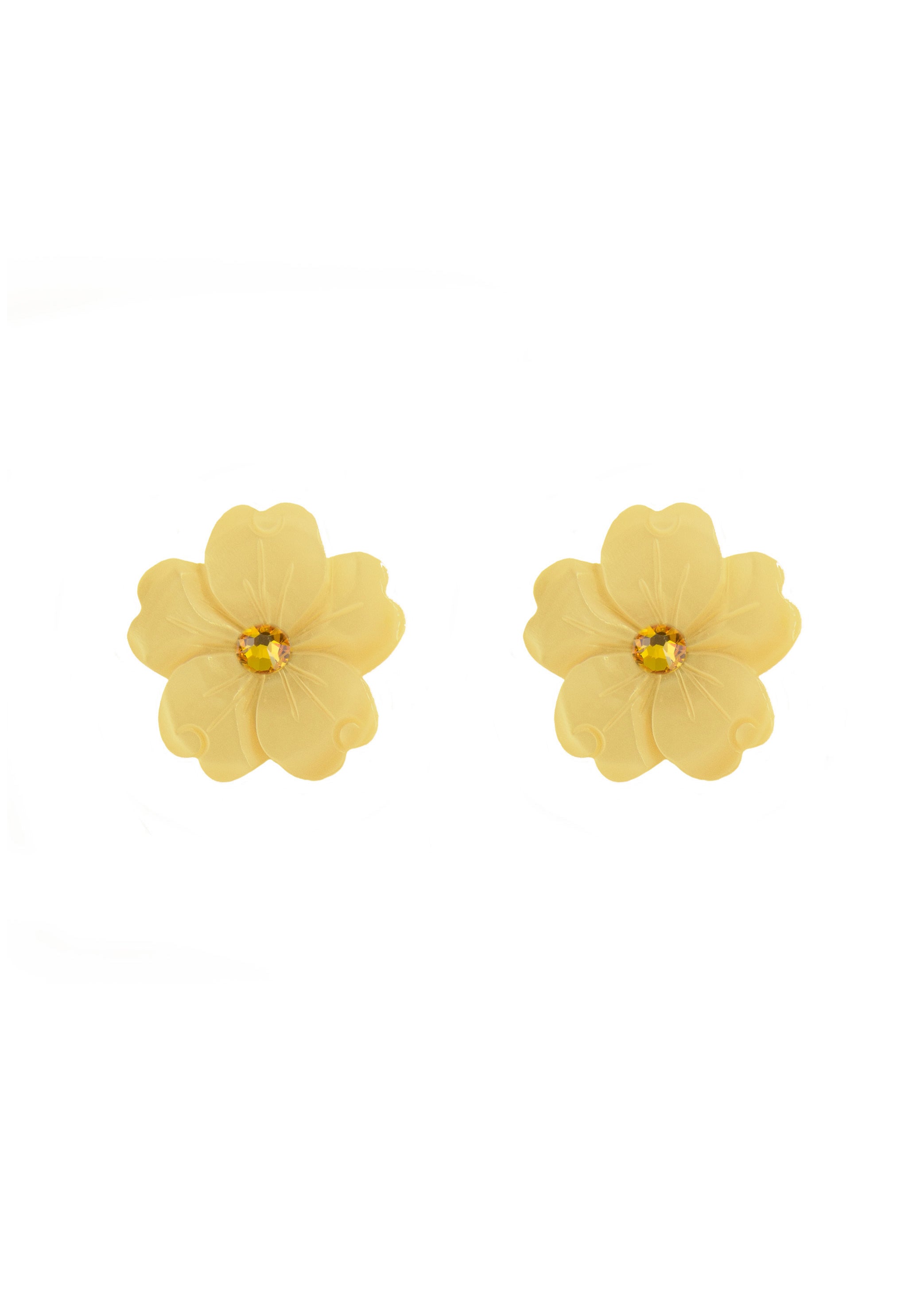 The INA mother-of-pearl finest crystal flower stud earrings are sweet and feminine, adding a modern-vintage touch to your look. These light weight nickel-free back metal earrings are simple enough that they can be worn for any occasion. Available in four different colors; you can choose from a sweet blush, romantic rose, bright yellow, or a traditional ivory pearl. The center pistol of the blush flowers is a silk blush brilliant cut crystal stone. The center stone of the ivory flowers is a clear brilliant cut crystal. They are attached to a push-back backing to make it easy to place in the ear, and come with a butterfly backing to stay securely in place. The flowers measure to approximately .75 inches in diameter.