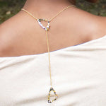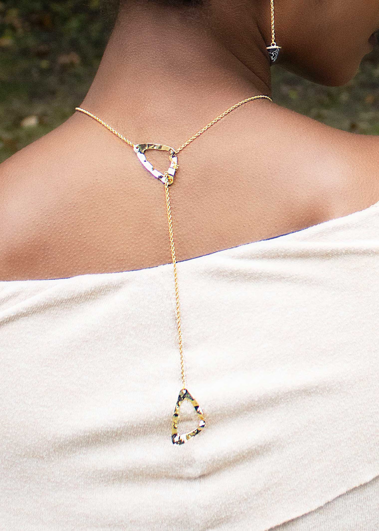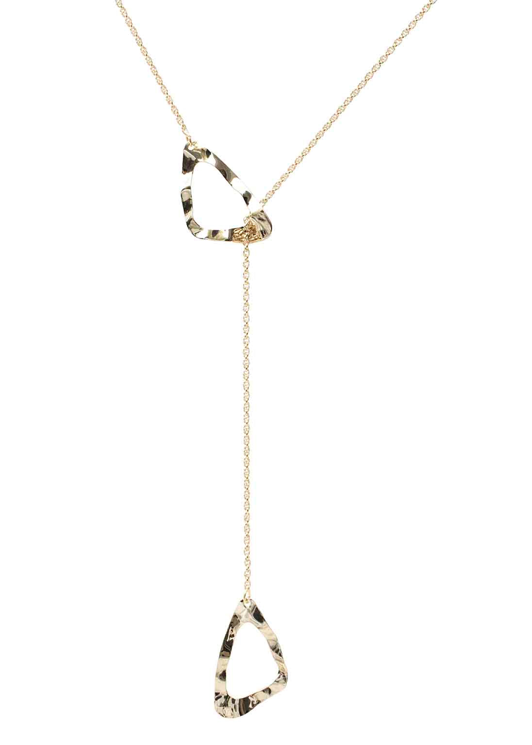 Add an element of fun to your wardrobe with the fashionable JENNIFER hammered metal lariat necklace. This modern necklace is made with a nickel-free metal delicate chain that is attached to a double triangular hammer metal design. Since this is a lariat style necklace, you can adjust the length of the necklace to whatever best fits your outfit. This beautiful accessory is available in a bright silver metal or a trendy gold metal that slips around the neck. It measure to approximately 22.5 inches in length.