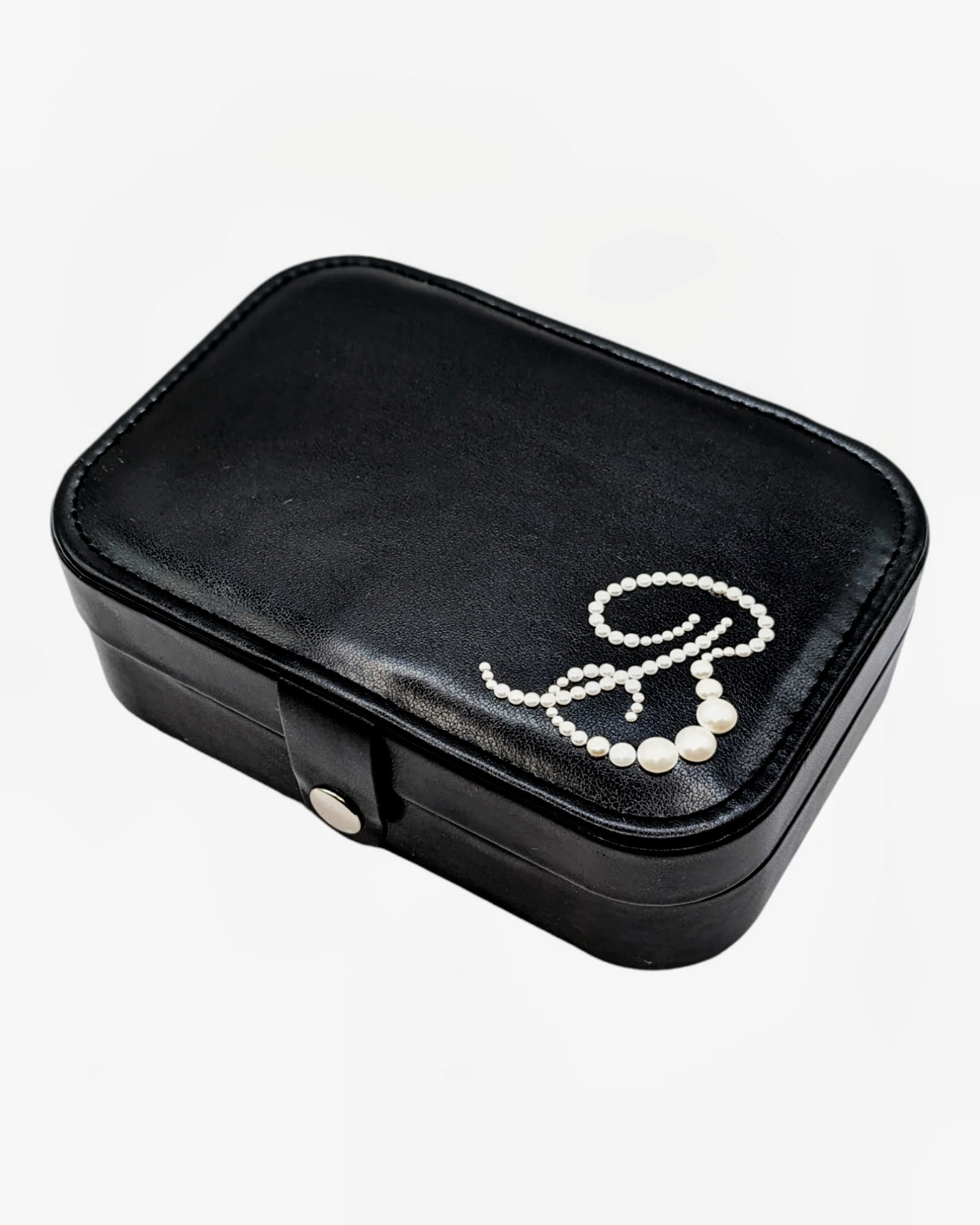Our travel jewelry box is the perfect personal gift for anyone on your list! The perfect gift for a friend, bridesmaid, bride-to-be or just to buy for yourself. You get to personalize the jewelry box with an initial (A-Z) made with the highest quality brilliant cut crystals, showing you put some thought into your gift. The outside is available as a soft ivory sparkle with a silver clasp closure. The inside has a place to hang 5 necklaces, with a divider that holds up to 10 pair of earrings. The bottom has a beautiful ring holder and 3 adjustable compartments on the right side that can hold bracelets or other loose items. This compact jewelry case can easily fit in your purse or travel bag. It measures 6.5 inches wide, by 4.5 inches long and approximately 2 inches high.