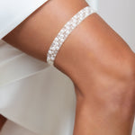 Finish your bridal look with this elegant garter made with the highest quality pearls and unfoiled crystals. Available in ivory, and measures to a standard 14 inches around. The pearls and crystal are placed on a sheer organza ribbon that is .5 inches wide and attached to a .5 inch wide soft elastic for optimal stretch and comfort.
