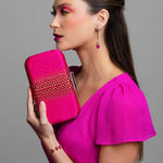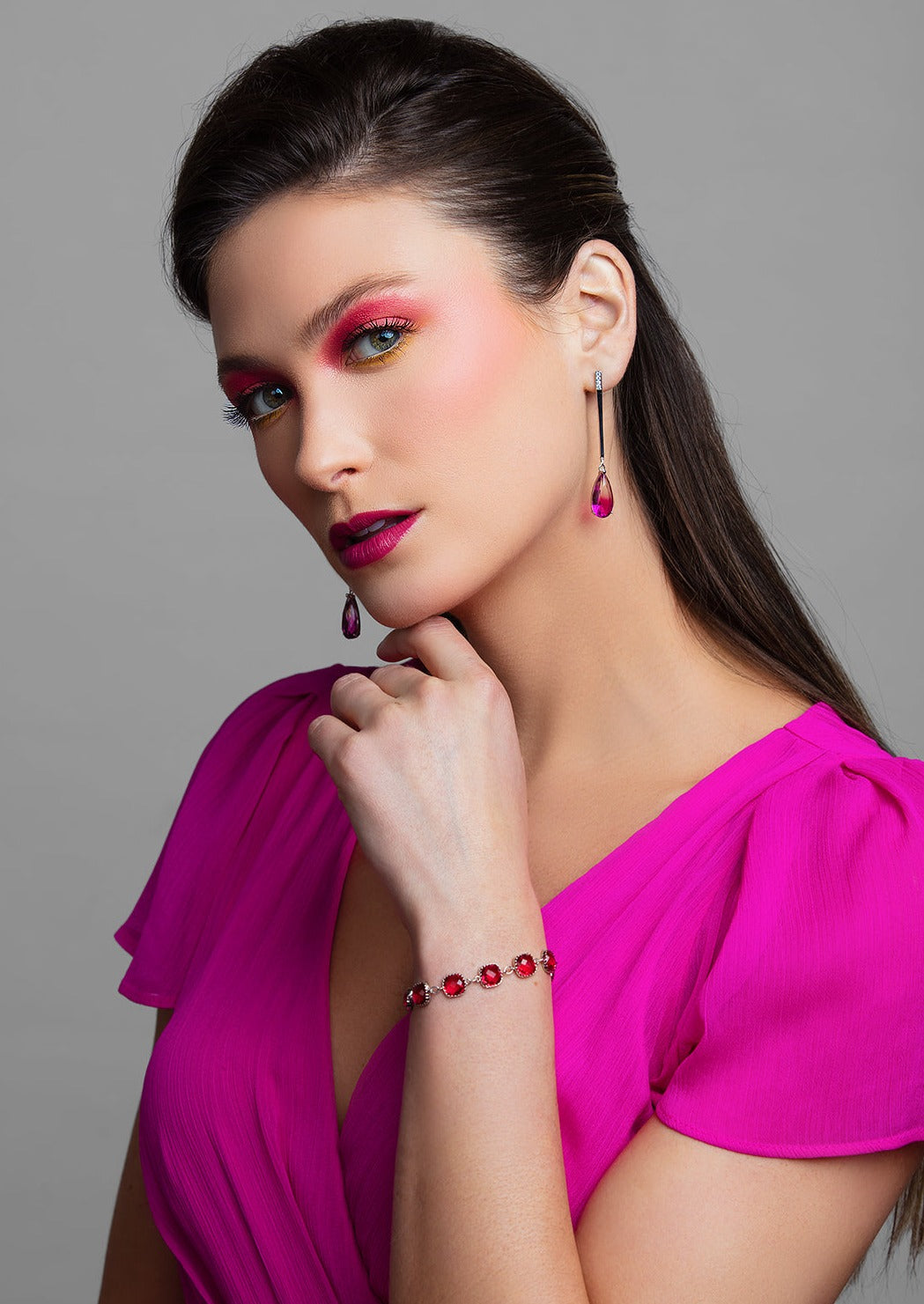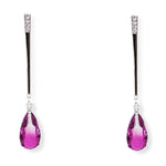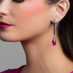 The elongated drop LYLA earrings add a pop of color to your wardrobe. The bright silver long stick post has a few pave crystal at the top to add that extra touch of sparkle. Connected to it is a narrow tear drop colorful crystal with a subtle ombre design. The crystal is available in a bright fuchsia pink or stunning sapphire blue. These earrings are attached to a push-back backing to make it easy to place in the ear and come with a butterfly backing to stay securely in place. The earring measures to approximately 2.25 inches in length.
