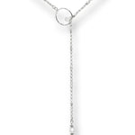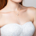 The MILA lariat necklace is perfect for your wedding day or just every day. Due to the lariat design, it can be worn in the front or back. This modern necklace has a circle pendant with a 6mm pearl on the inside. At the other end, there is an Austrian crystal and pearl that pulls through. Available in a bright silver or trendy gold, this necklace measures to approximately 24 inches in length.