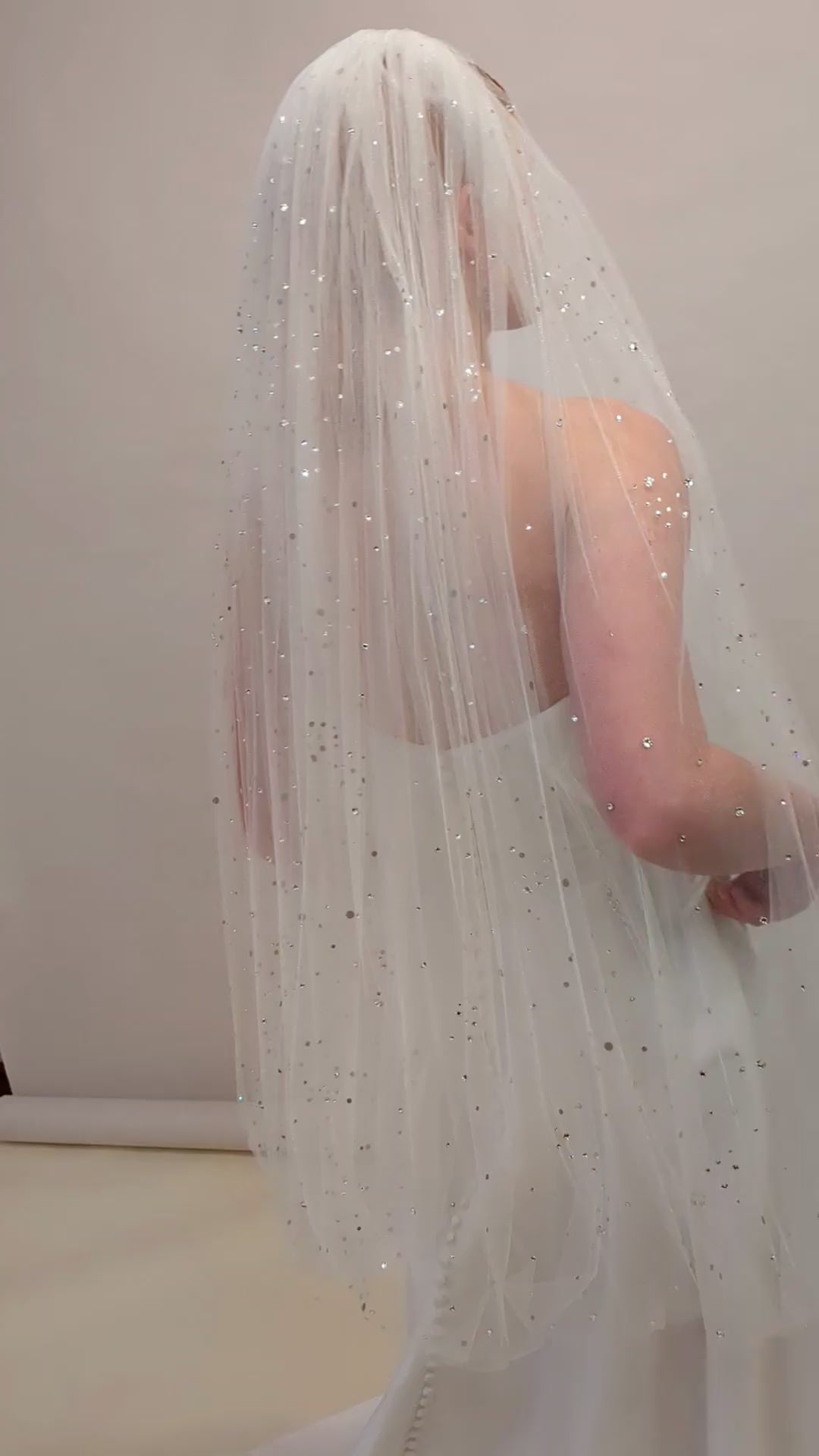 Sparkle like a star on your special day in the NOVA veil, a modern fingertip length bubble veil that is embellished with 1000 brilliant Austrian crystals! The two layers of delicate tulle will keep all eyes—and paparazzi—on you!