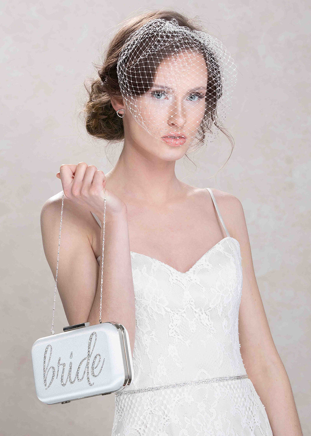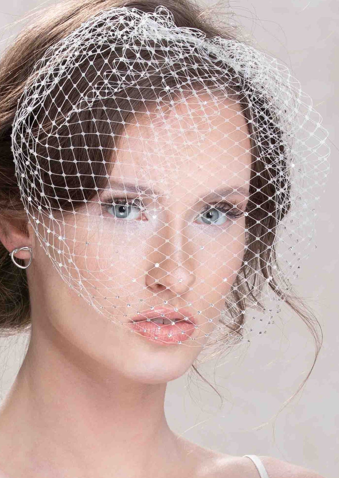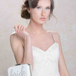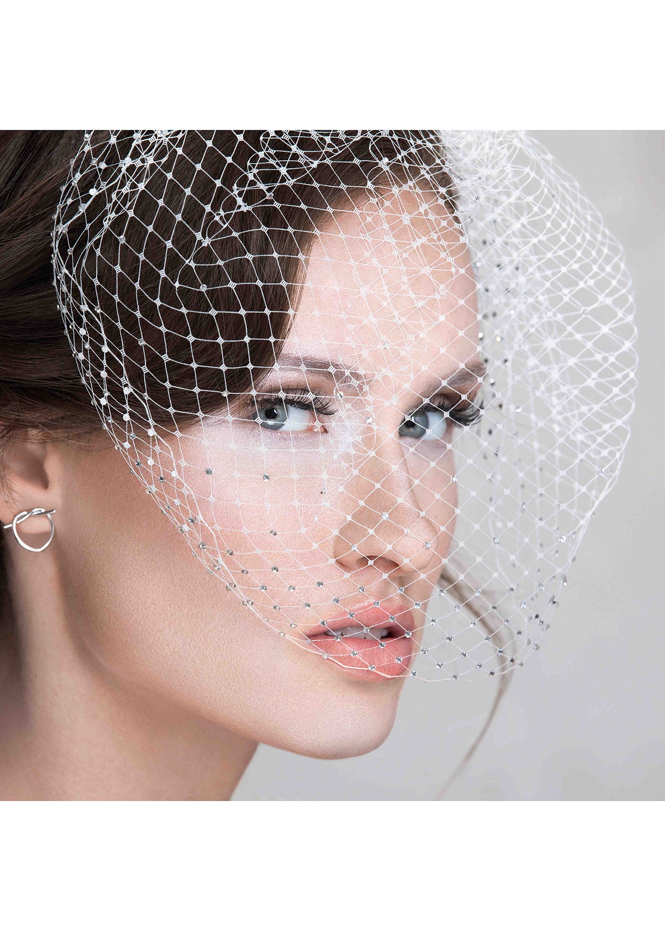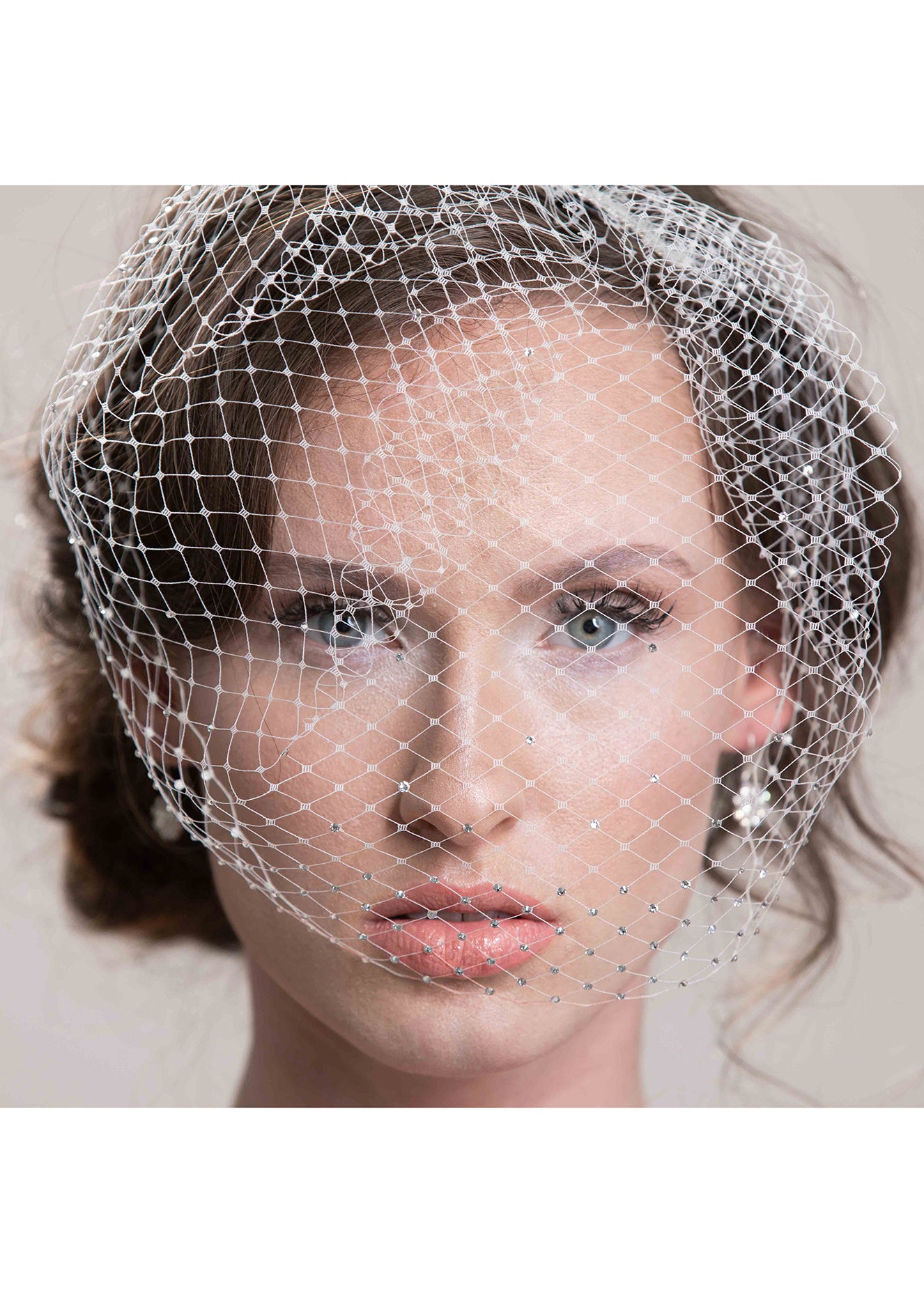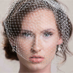 Add a vintage twist to your modern look with the sparkly CASSIDY birdcage veil. To add glamour to this accessory there are hundreds of tiny brilliant cut crystals delicately placed along the bottom of the cage veil, then lightly scattered at the top. This will add optimal sparkle to your wedding day attire. The bridal veil is made with Russian netting which is attached to a 3 inch wide silver metal comb to stay securely in your hair. This Old Hollywood inspired bridal accessory is available in a variety of colors: traditional bright white, vintage ivory, modern silver, bright gold and daring black.