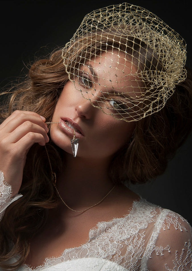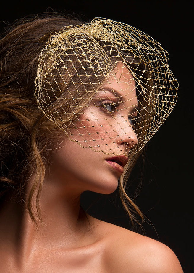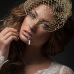 Add a vintage twist to your modern look with the sparkly CASSIDY birdcage veil. To add glamour to this accessory there are hundreds of tiny brilliant cut crystals delicately placed along the bottom of the cage veil, then lightly scattered at the top. This will add optimal sparkle to your wedding day attire. The bridal veil is made with Russian netting which is attached to a 3 inch wide silver metal comb to stay securely in your hair. This Old Hollywood inspired bridal accessory is available in a variety of colors: traditional bright white, vintage ivory, modern silver, bright gold and daring black.