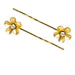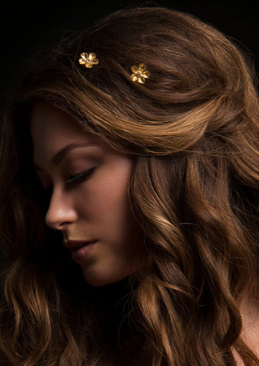 These DEMI are delicate crystal gold metal flower hairpins that will add the perfect touch of romance or bohemian feel to any hairstyle. Comes in a set of 2.