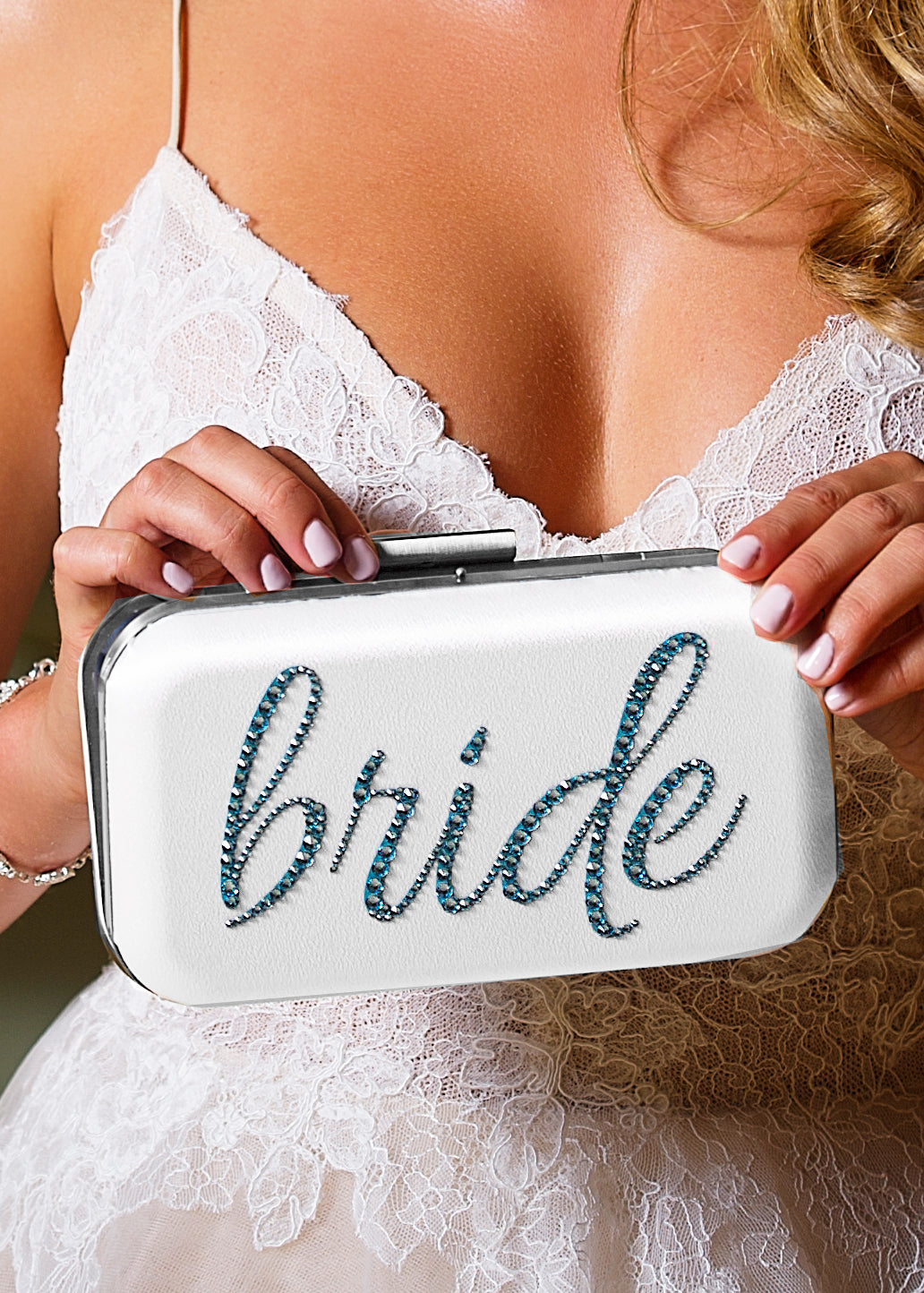 Have your happily EVER AFTER with our top selling bride clutch, which is the perfect accessory for your engagement party, bridal shower and wedding day! Adorned with highest quality, brilliant cut crystals and pearls, this purse will add the perfect touch of sparkle and glamour. This clutch advertises your place on your big day as boldly as your wedding dress does using a gorgeous collection of sparkly crystals or the finest imitation pearls swirling around the center. The crystals spell out the word "bride" in a cursive-inspired font, creating a sparkling, eye-catching look. The crystals can be applied in your choice of colors, including opal, clear, blue, gold, blush or black. The satin backdrop that the crystals are applied to is ultra smooth and soft against the skin and also comes in a selection of colors, including classic ivory, blush, white, black, blue and blush, letting you mix and match the colors of the satin and crystals. The satin rests on a strong metal frame that is complete with a sturdy kiss-style closure. Overall, the clutch measures 7.75 inches in width by 4.5 inches in height and is the perfect size for carrying.