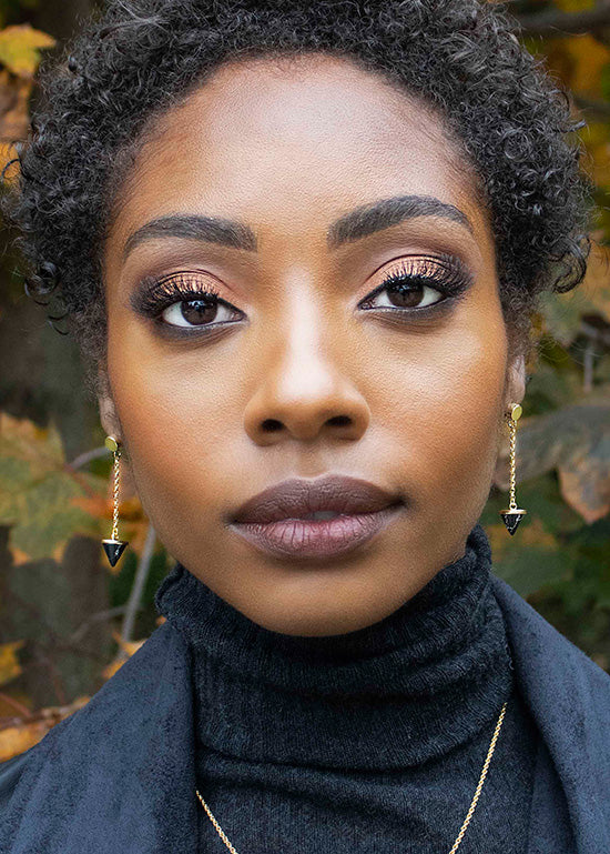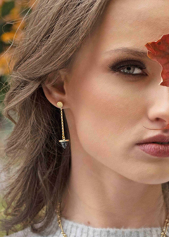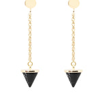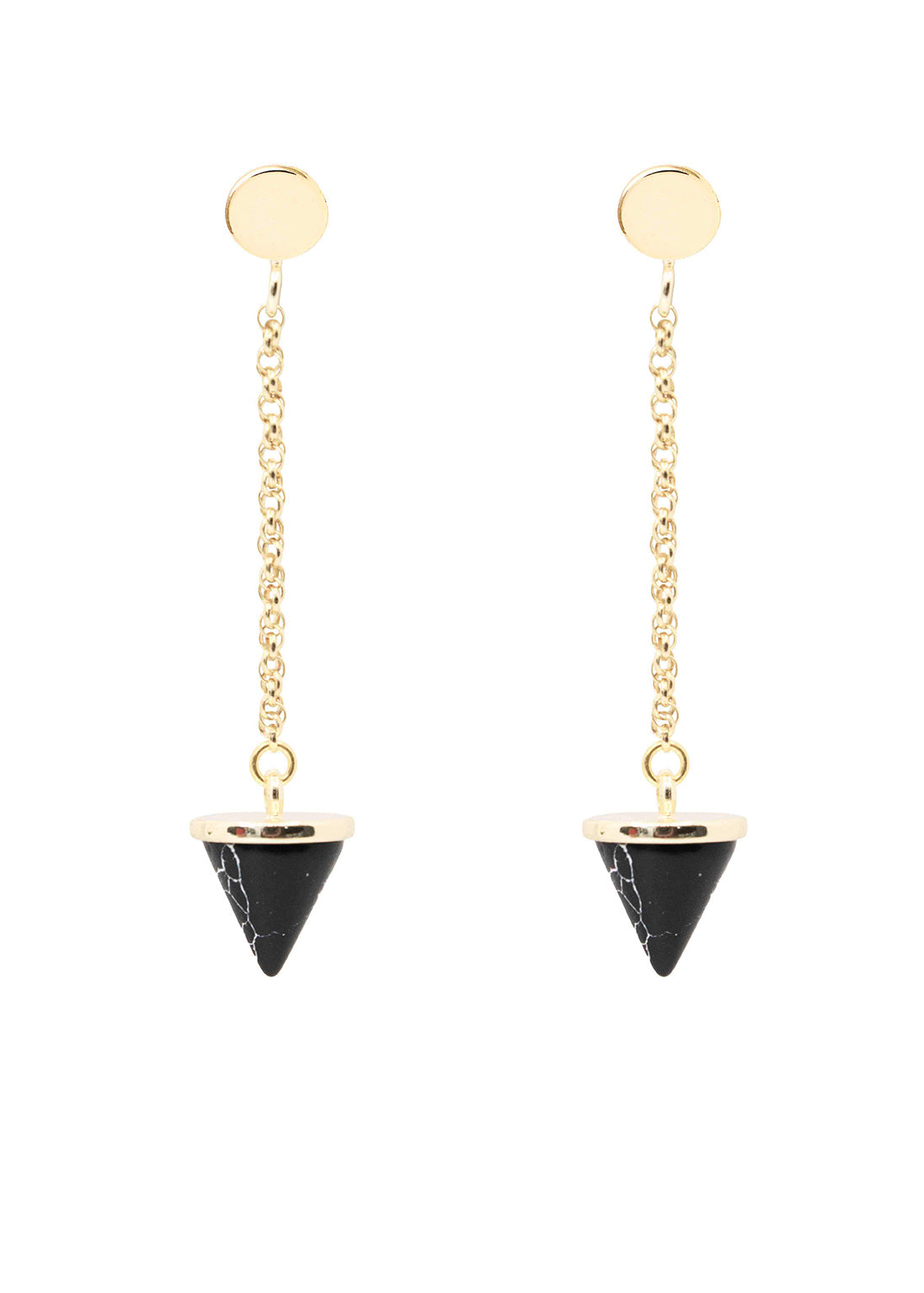 The JULIET clay spike earrings are edgy and fun. These drop earrings are available in modern white or trendy black. The chain and round post are available in only a bright gold plated nickel-free metal. These fun yet simple earrings can be easily transitioned from day to night. They are a push-back backing to make it easy to place in the ear and come with a butterfly backing to stay securely in place. The earring measures to approximately 1.5 inches in length.