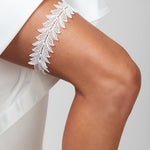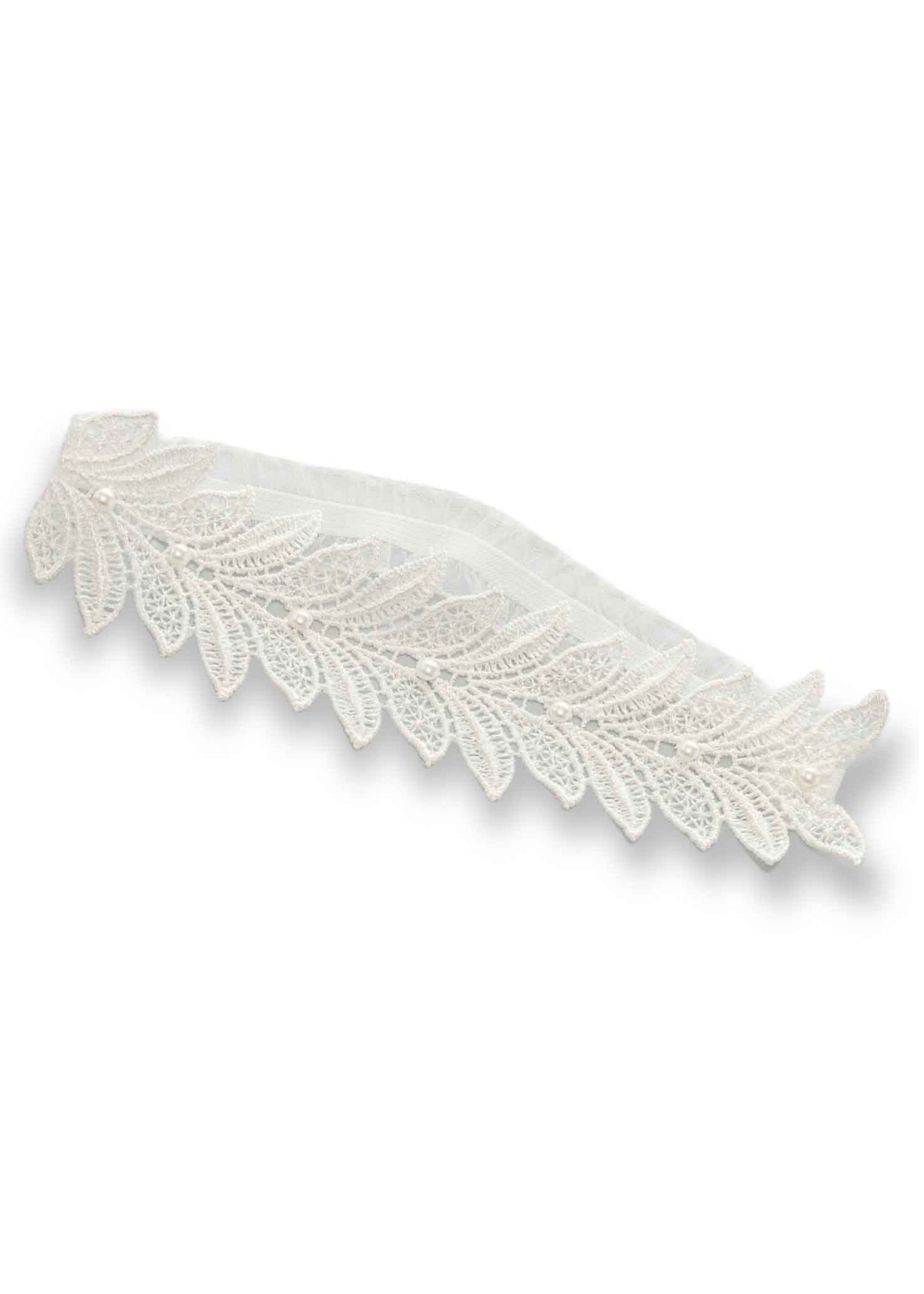 Walk down the aisle and complete your bridal look with the contemporary and venetian lace and pearl KAYDEN garter. The off-white lace is adorned with the finest imitation pearls. Available in modern off white, this garter will be the finishing touch a bride needs on her wedding day. The garter measures to a standard 14 inches around. The lace is attached to a .5 inch wide ruffle sheer elastic for optimal stretch and comfort.