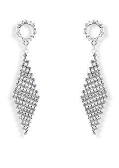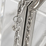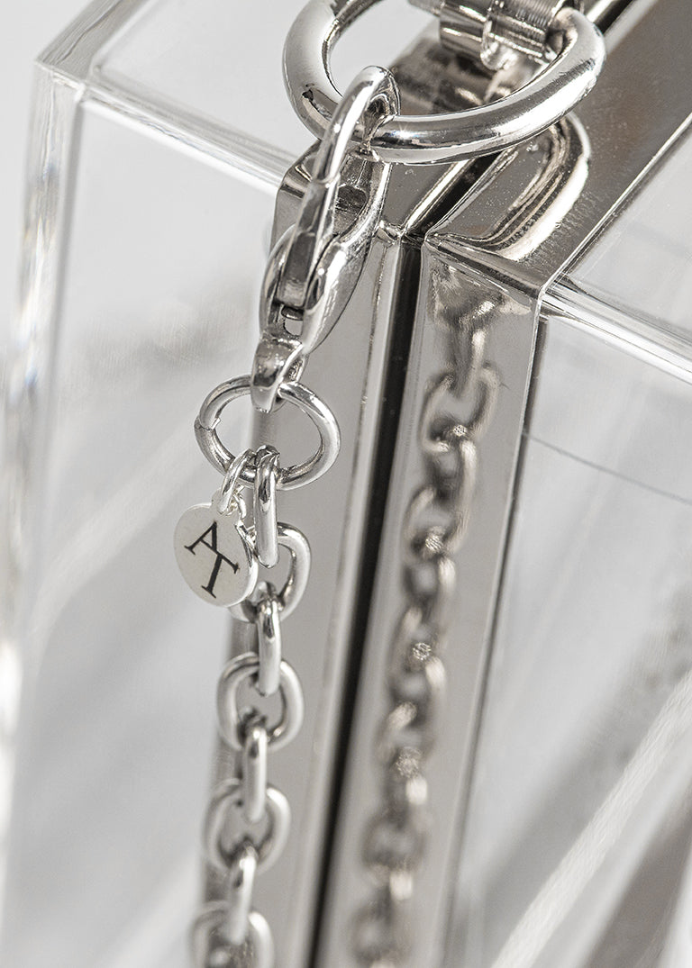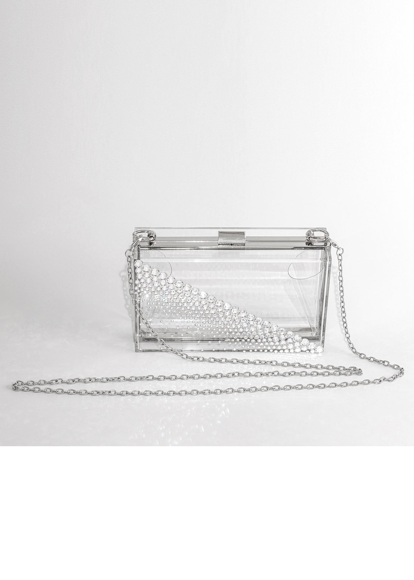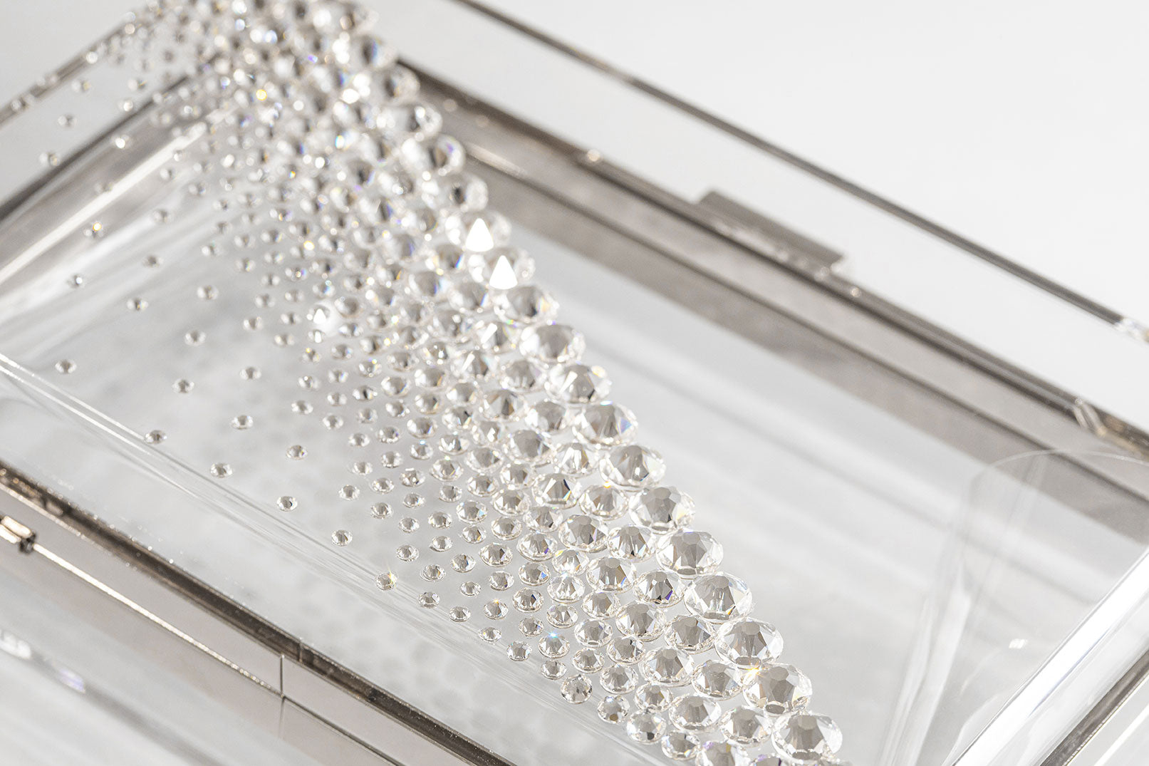 This sparkly KRISTY clutch is a lucite clutch embellished with the highest quality brilliant cut crystals. The crystals are placed on a diagonal to create a modern design. The crystals go from larger to smaller that fade to a light scatter on the bottom. This see-through clear plastic clutch is fashioned out of strong, yet lightweight metal with a rectangular frame that peeks out along the border of the clutch, which measures 7 inches in length by 4 inches in height.