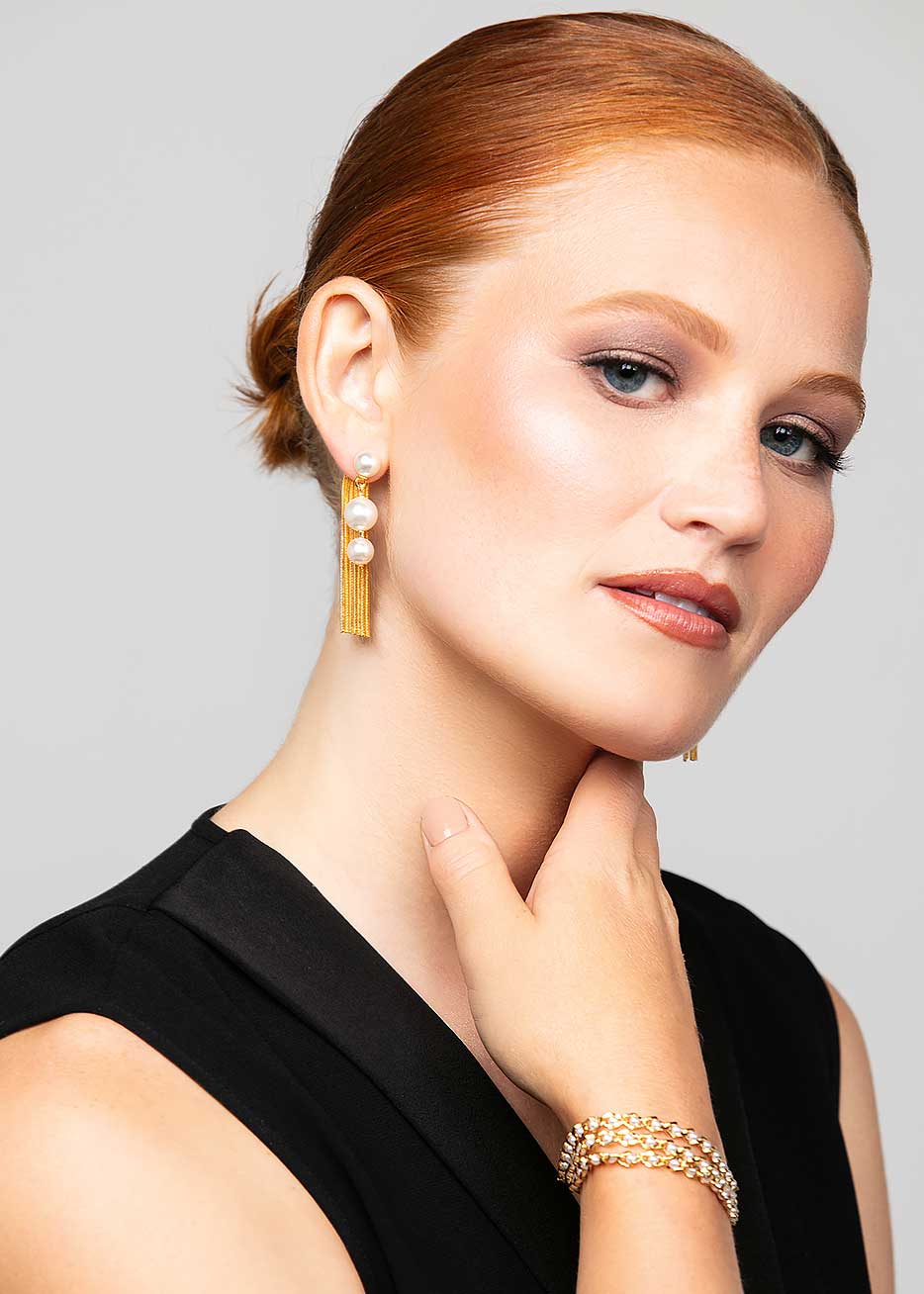 Spice up your look with the perfect accessory - our OTTO earrings! With a triple Austrian pearl drop and a metal fringe back, these earrings bring a fabulous flair to any outfit. Get ready to turn heads!
