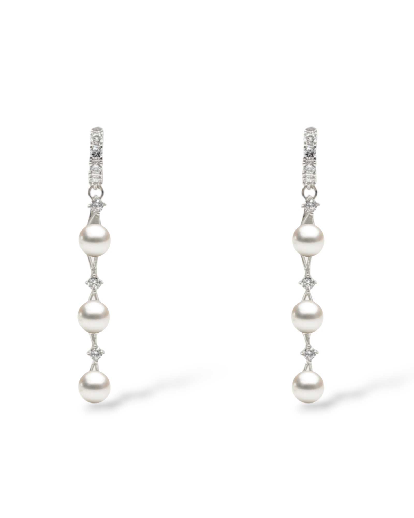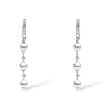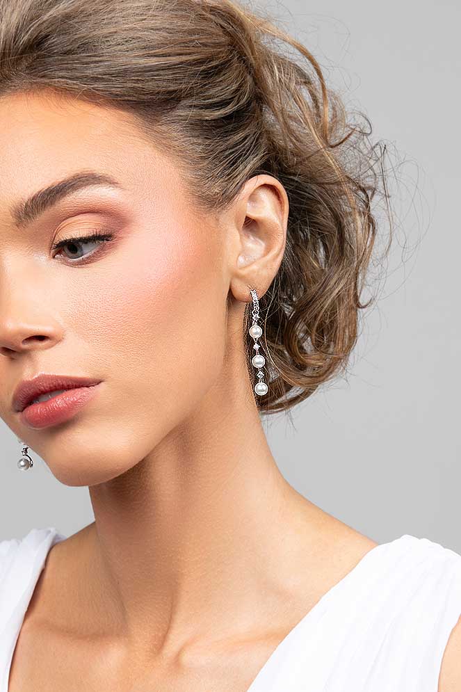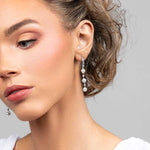 Model wearing the Ariel Taub Pearla earrings in silver which are a long drop containing 3 pearls and pave CZ crystals in between the pearls