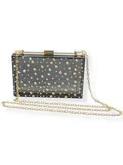Model wearing the Perry cubic zirconia crystal drop earrings in gold paired with the Parker black lucite clutch that is embellished with gold crystals in a polka dot design