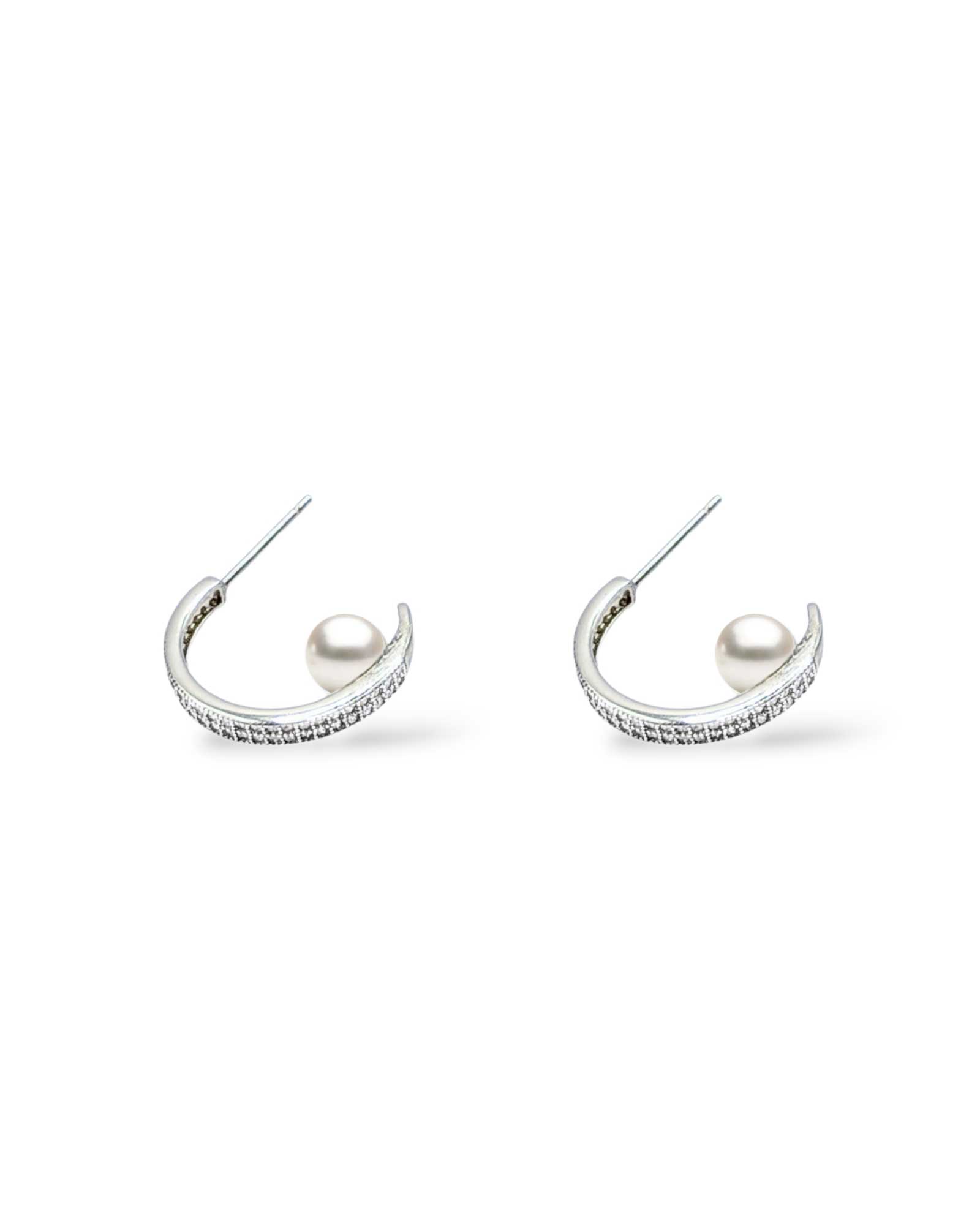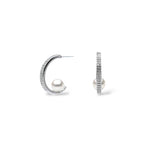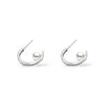 Model wearing the Prim cubic zirconia pave crystal partial hoop earrings with a floating pearl on the inside