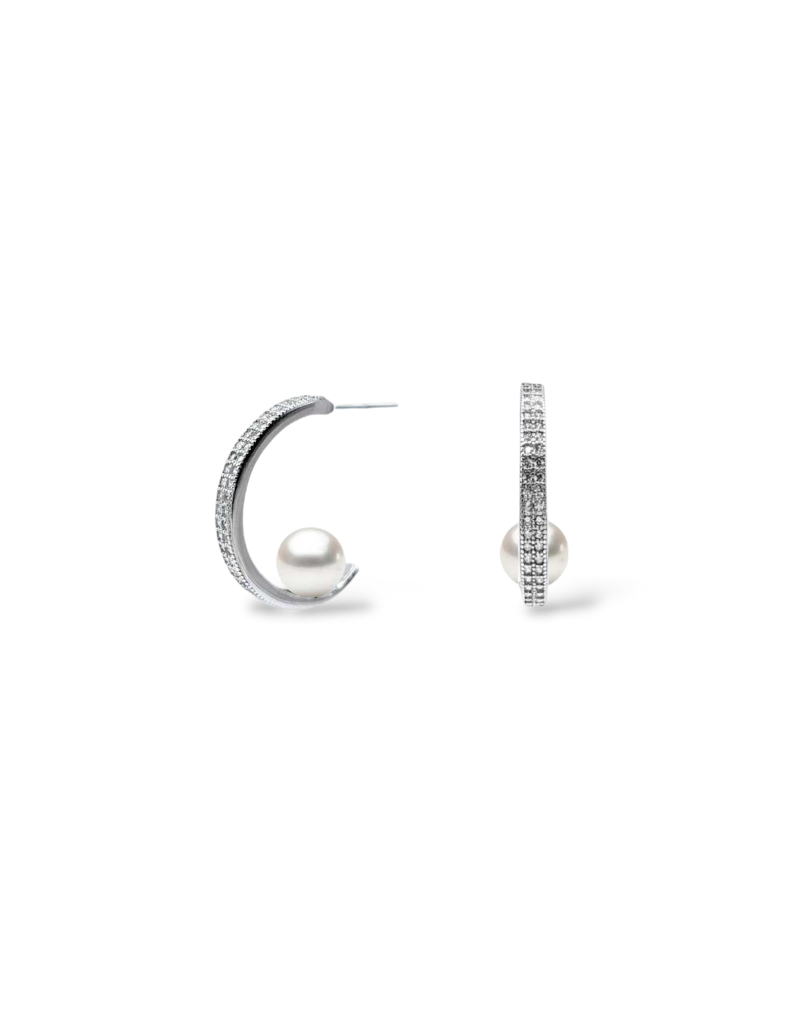 Adorned with a daring arrangement of sparkling pave cubic zirconia crystals, each facet glistens like stars against the midnight sky, casting an enchanting allure upon the beholder. But it doesn't end there. A playful twist awaits, as a single, lustrous pearl delicately floats within the hoop, adding a touch of whimsy and intrigue to the ensemble.